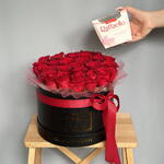 Шляпная коробка - 1 шт. Пиафлор - 2 шт. роза красная freedom - 25 шт. raffaello 150 г - 1 шт.