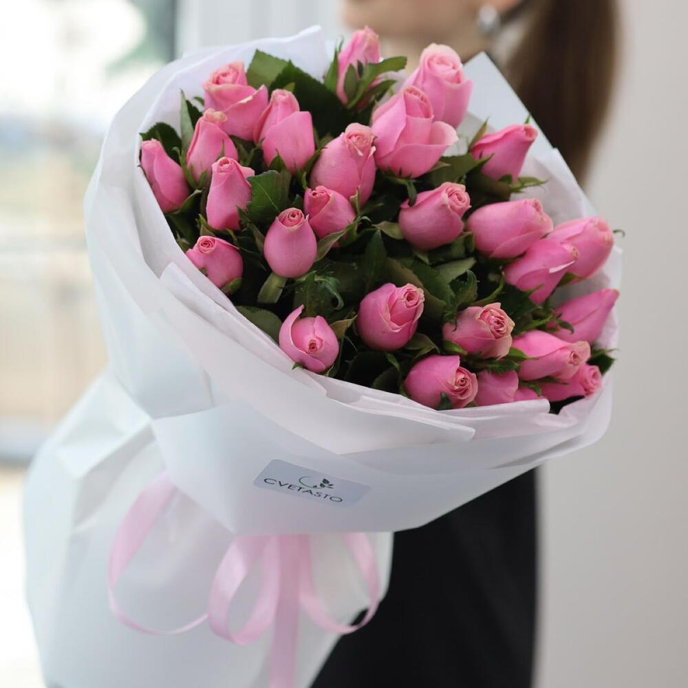 25 розовых роз в оформлении