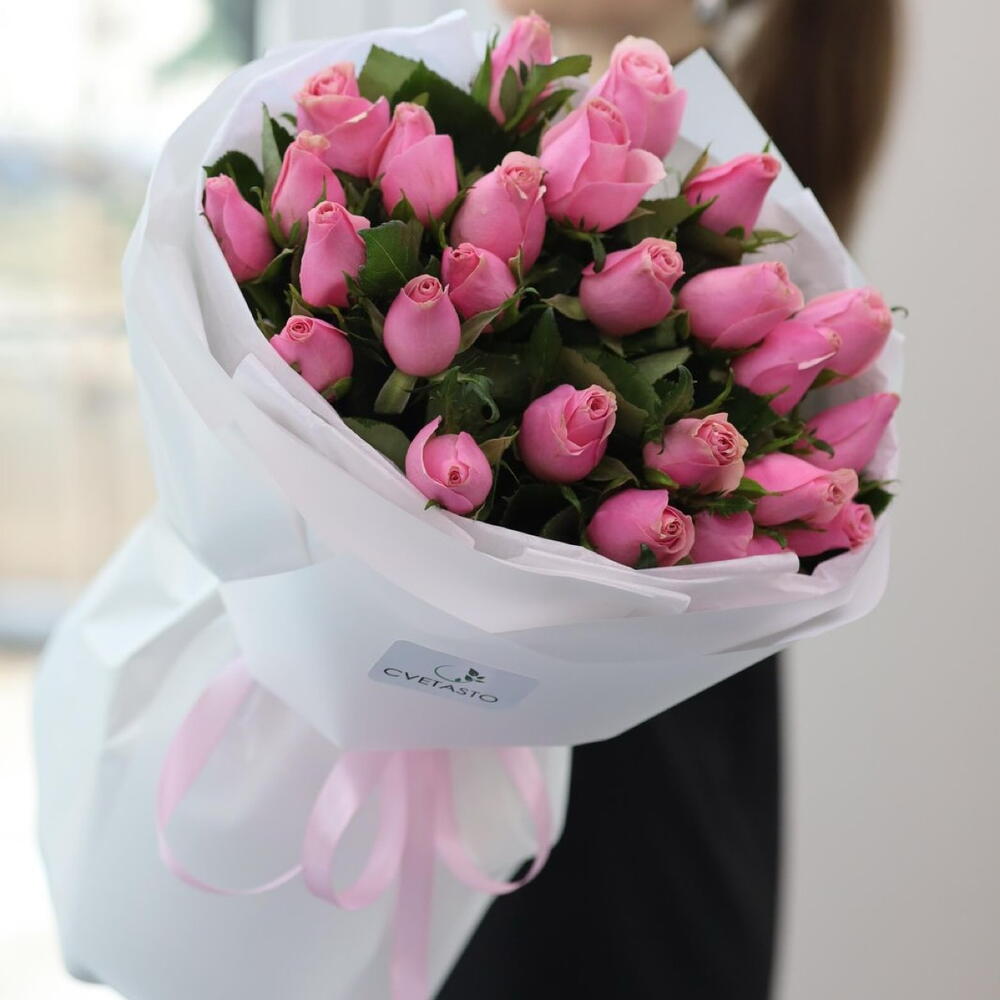 25 розовых роз в оформлении