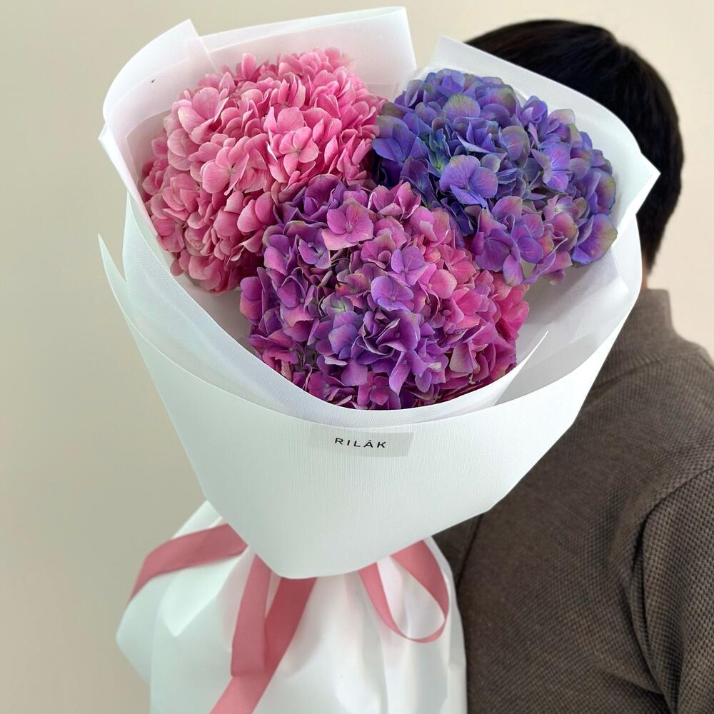 Букет из 3 шикарных, пышных гортензий, уникальных цветов в брендированном оформлении