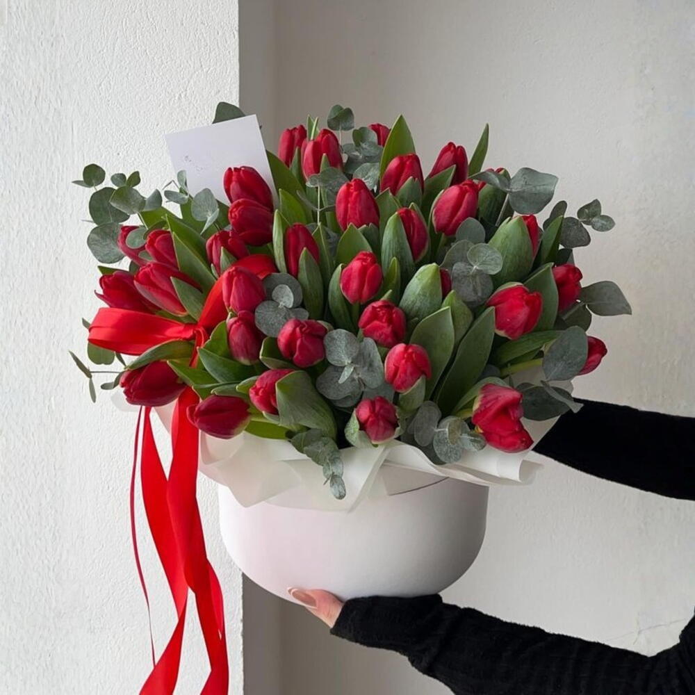 Эвкалипт - 2 шт. Коробка - 1 шт. тюльпаны - 35 шт.
