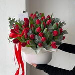 35 тюльпанов в коробке с добавлением эвкалипта