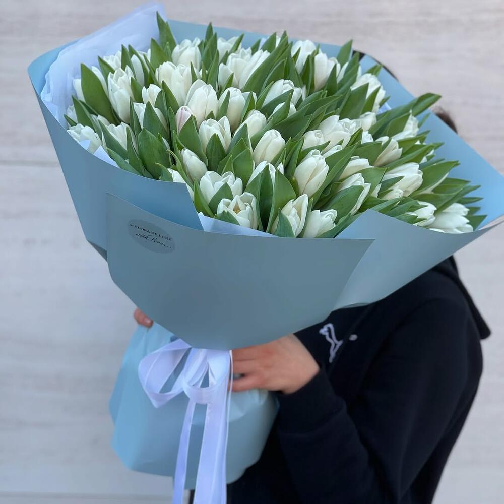 белые тюльпаны в дизайнерской упаковка - 51 шт.