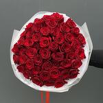 Букет из 51 голландской красной розы (длина стебля 50–60 см) — это роскошная, плотная композиция с крупными бархатными бутонами насыщенного алого оттенка. Розы имеют ровные длинные стебли и густую зелёную листву, благодаря чему букет выглядит объёмным, гармоничным и статусным. Такой подарок символизирует страсть, любовь и уважение, идеально подходит для торжественных признаний или особых дат.
