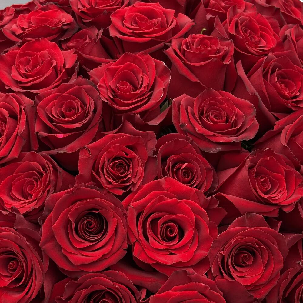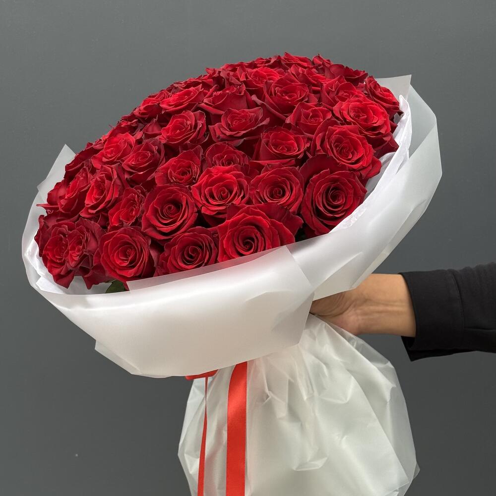 Букет из 51 голландской красной розы (длина стебля 50–60 см) — это роскошная, плотная композиция с крупными бархатными бутонами насыщенного алого оттенка. Розы имеют ровные длинные стебли и густую зелёную листву, благодаря чему букет выглядит объёмным, гармоничным и статусным. Такой подарок символизирует страсть, любовь и уважение, идеально подходит для торжественных признаний или особых дат.