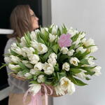 Тюльпан - 51 шт. Открыточка с вашими пожеланиями - 1 шт. Корзина ротанговая - 1 шт. фирменное оформление - 1 шт.