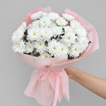 Нежный и воздушный букет из белоснежных хризантем выглядит очень свежо и элегантно. Он словно наполнен лёгкостью и спокойствием, создавая ощущение чистоты и уюта. Такой букет подойдёт для поздравления с днём рождения, выписки, свадьбы, 8 Марта или в качестве деликатного комплимента. Белые хризантемы символизируют искренность, добрые намерения и гармонию. Композиция аккуратно оформлена в мягкую розовую упаковку, подчёркивающую нежность цветов. Букет универсален и уместен в любой ситуации. Рекомендации по уходу: перед тем как поставить букет в воду, обновите срезы стеблей; меняйте воду ежедневно и держите цветы вдали от прямого солнца, отопительных приборов и сквозняков.