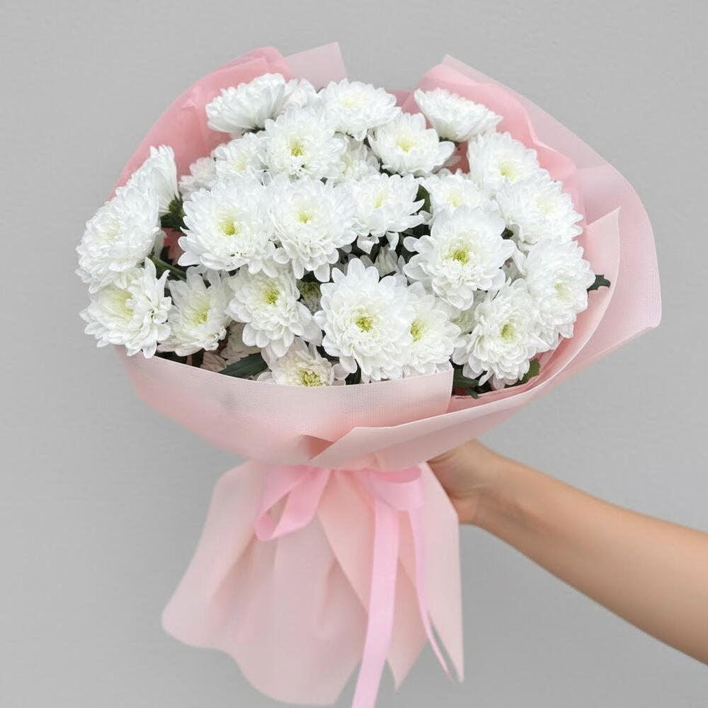 Нежный и воздушный букет из белоснежных хризантем выглядит очень свежо и элегантно. Он словно наполнен лёгкостью и спокойствием, создавая ощущение чистоты и уюта. Такой букет подойдёт для поздравления с днём рождения, выписки, свадьбы, 8 Марта или в качестве деликатного комплимента. Белые хризантемы символизируют искренность, добрые намерения и гармонию. Композиция аккуратно оформлена в мягкую розовую упаковку, подчёркивающую нежность цветов. Букет универсален и уместен в любой ситуации. Рекомендации по уходу: перед тем как поставить букет в воду, обновите срезы стеблей; меняйте воду ежедневно и держите цветы вдали от прямого солнца, отопительных приборов и сквозняков.