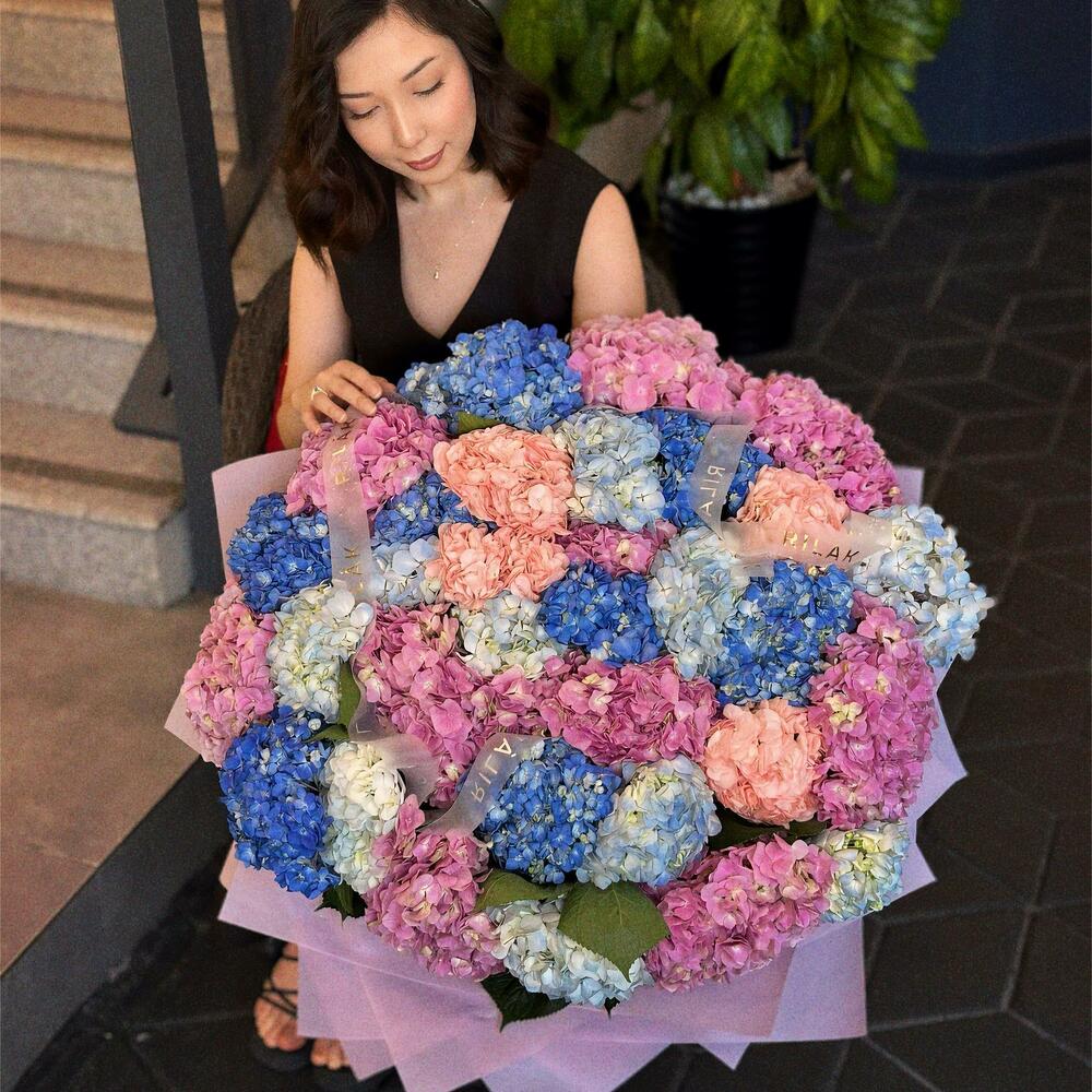 Авторский букет из 33 гортензий — это настоящее произведение флористического искусства. Пышные соцветия создают объёмную, воздушную композицию, которая выглядит роскошно и благородно. Такой букет подойдёт для самых торжественных случаев — он вызывает восхищение с первого взгляда и остаётся в памяти надолго.