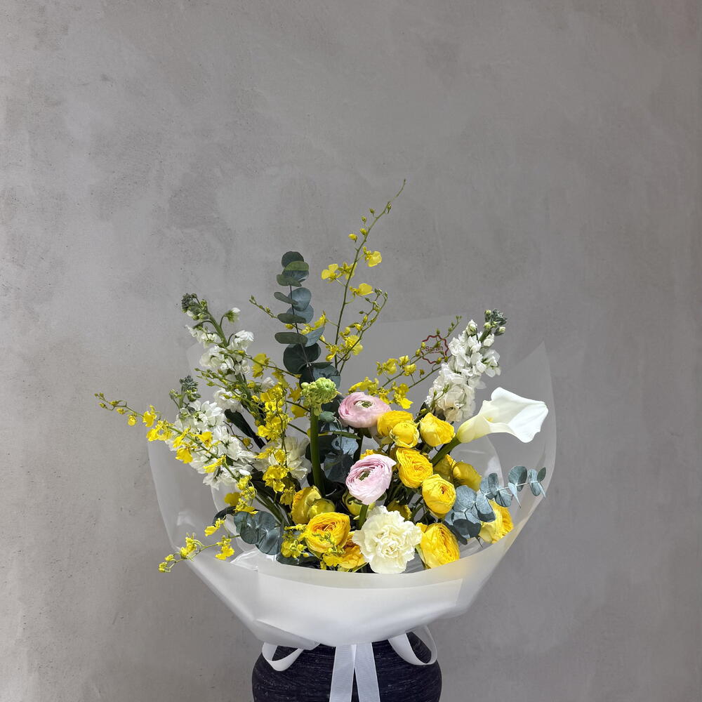 Калла - 1 шт. Маттиола - 3 шт. Эвкалипт - 1 шт. Кустовая роза - 3 шт. Гвоздика - 1 шт. Орнитогалум - 1 шт. Ранункулюс - 3 шт. онцидиум - 2 шт.
