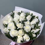 Элегантный аква букет из белых голландских роз — это классика, которая всегда выглядит дорого и уместно. Чистый белый цвет символизирует искренность, уважение и нежность, поэтому такой букет идеально подойдёт для дня рождения, свадьбы, юбилея, благодарности или делового подарка. Живые розы установлены в аква-упаковке с водой, что позволяет сохранить их свежесть дольше без необходимости сразу ставить в вазу. Зелень фисташки подчёркивает форму букета и добавляет ему объёма и естественности. Букет выглядит аккуратно, стильно и презентабельно, готов к вручению сразу после покупки.