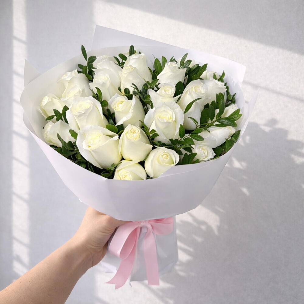 Элегантный аква букет из белых голландских роз — это классика, которая всегда выглядит дорого и уместно. Чистый белый цвет символизирует искренность, уважение и нежность, поэтому такой букет идеально подойдёт для дня рождения, свадьбы, юбилея, благодарности или делового подарка. Живые розы установлены в аква-упаковке с водой, что позволяет сохранить их свежесть дольше без необходимости сразу ставить в вазу. Зелень фисташки подчёркивает форму букета и добавляет ему объёма и естественности. Букет выглядит аккуратно, стильно и презентабельно, готов к вручению сразу после покупки.