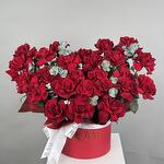 Изящная композиция из 25 красных роз в элегантной коробке, дополненная свежей зеленью эвкалипта. Этот букет символизирует страсть, романтику и изысканный вкус. Идеальный подарок для выражения любви и восхищения.
