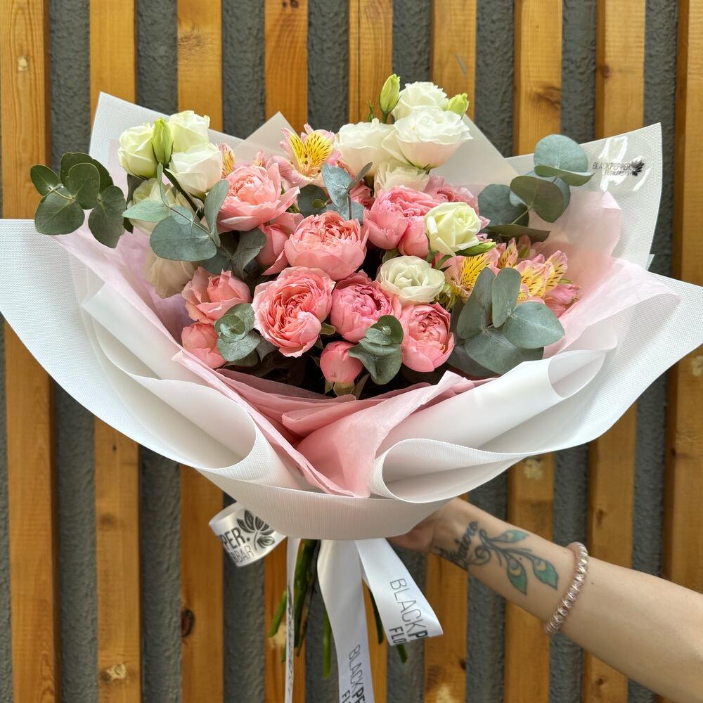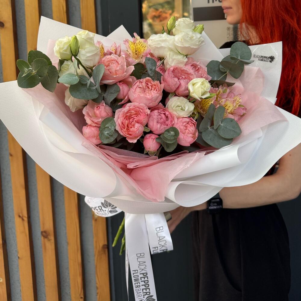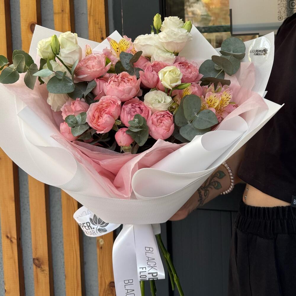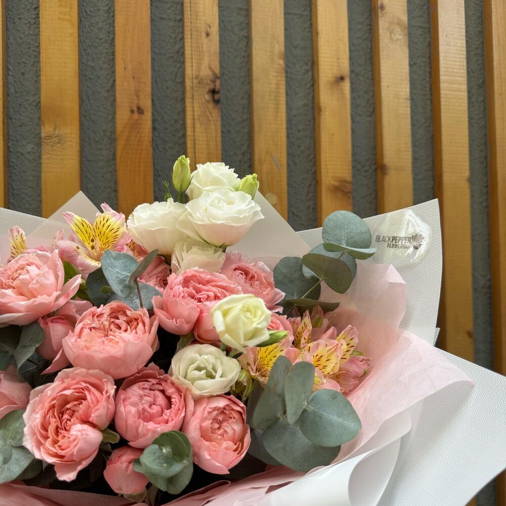 Альстромерия - 3 шт. Эвкалипт - 4 шт. Эустома - 3 шт. juliet rose - 5 шт.