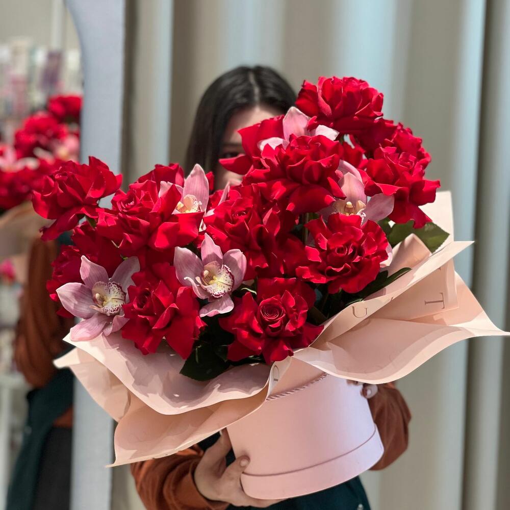 Орхидея Цимбидиум - 5 шт. Шляпная коробка - 1 шт. Роза фридом 60 см - 15 шт.