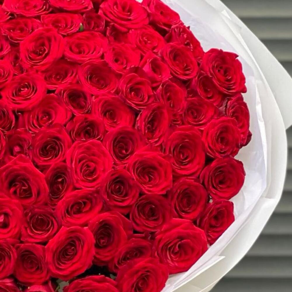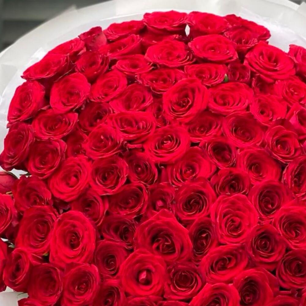 Упаковка дизайнерская - 8 шт. Лента атласная белая - 1 шт. розы красные - 101 шт.