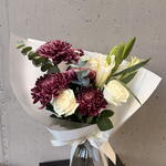 Лилия - 1 шт. Хризантема одноголовая - 5 шт. Эвкалипт Цинерея - 2 шт. розы - 3 шт.