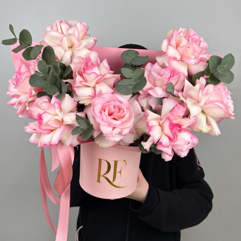 Эвкалипт - 1 шт. Фирменная коробка - 1 шт. Оазис флористический - 1 шт. розы - 11 шт.
