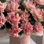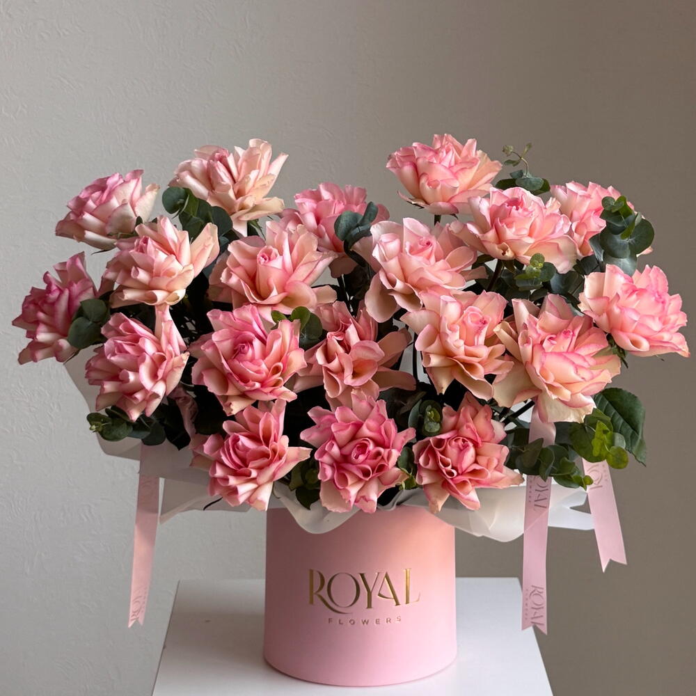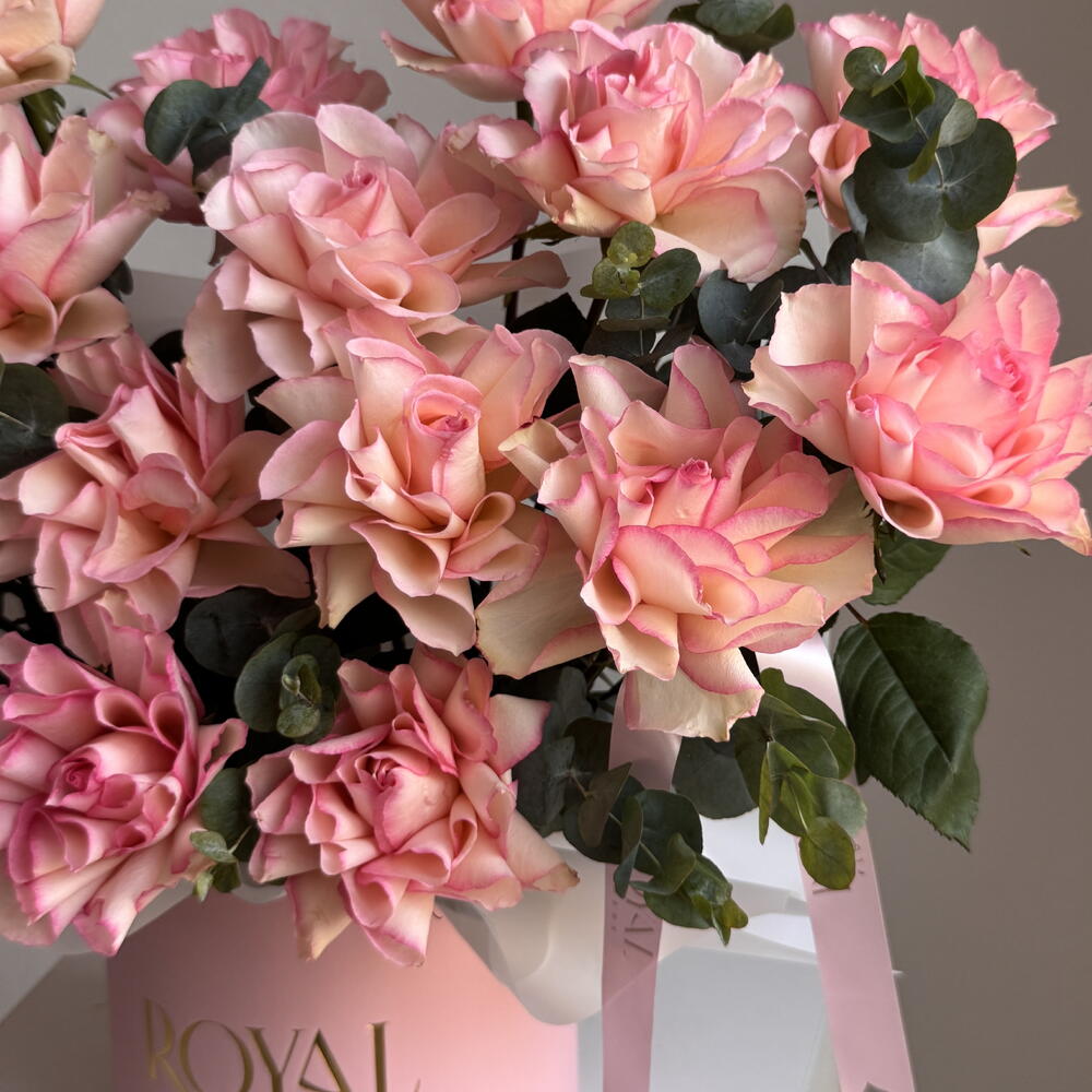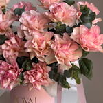 Коробка шляпная - 1 шт. Оазис флористический - 2 шт. Эвкалипт Цинерея - 5 шт. розы голландские - 19 шт. оформить - 1 шт.