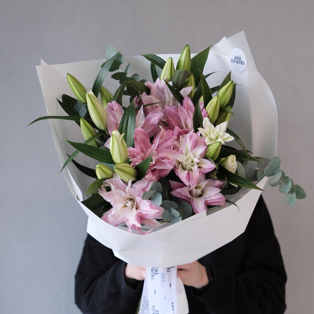 Лилия - 5 шт. Эвкалипт - 1 шт. Упаковка дизайнерская - 1 шт.