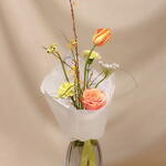 Сборный мини-букет в яркой оранжево-зеленой гамме из сезонных цветов. В составе форзиция, роза кахала, тюльпан, гвоздика, орнитогалум. Букет упакован в белую бумагу и белую коробку с тематической открыткой по запросу. Состав цветов на фото — примерный, но букет будет в изображенной цветовой гамме, настроении и размере.