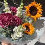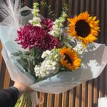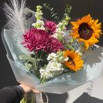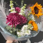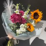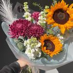 Маттиола - 4 шт. Эвкалипт - 2 шт. Подсолнух - 2 шт. бигуди хризантема - 3 шт.