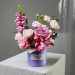 Гвоздика - 2 шт. Коробка шляпная - 1 шт. Роза кустовая пионовидная - 1 шт. Роза Эквадор 60 см - 1 шт. Антирринум - 1 шт.