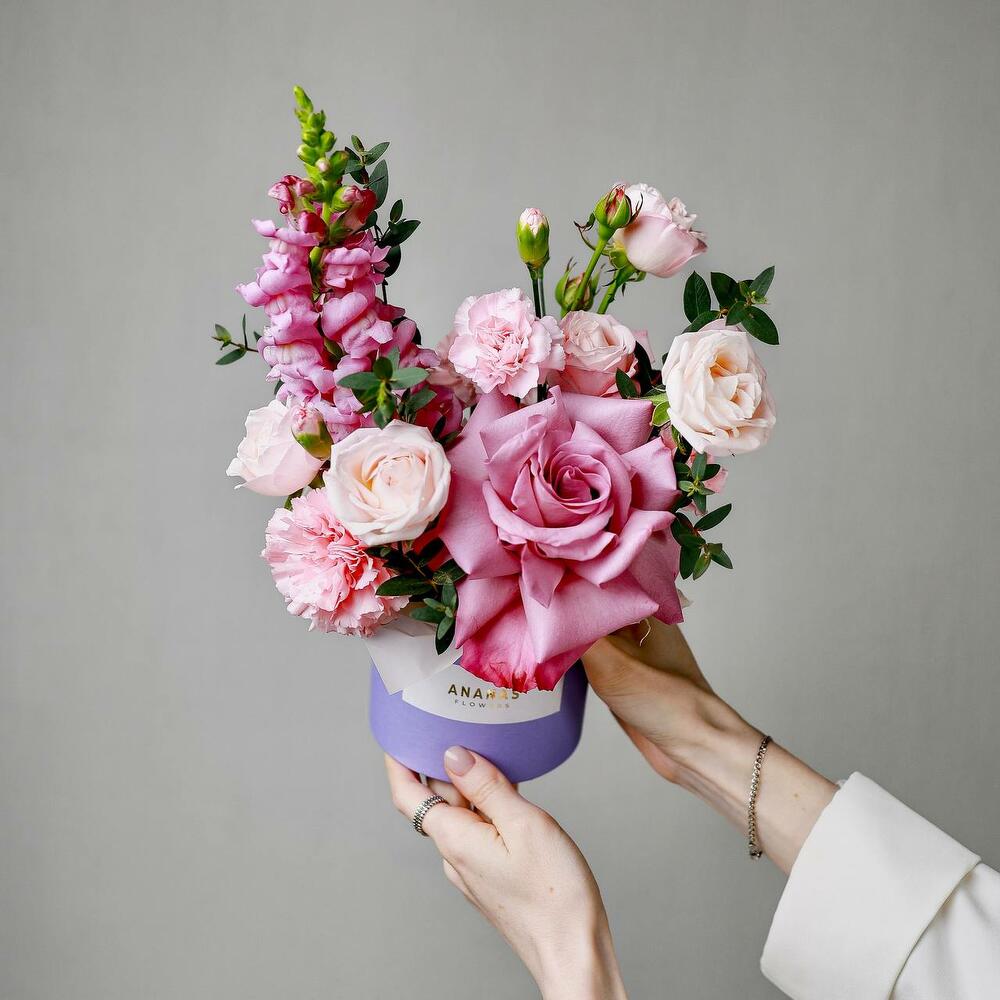 Гвоздика - 2 шт. Коробка шляпная - 1 шт. Роза кустовая пионовидная - 1 шт. Роза Эквадор 60 см - 1 шт. Антирринум - 1 шт.