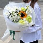 Лизиантус - 1 шт. Маттиола - 1 шт. Хризантема кустовая - 2 шт. Подсолнух - 1 шт. гвоздики - 3 шт.