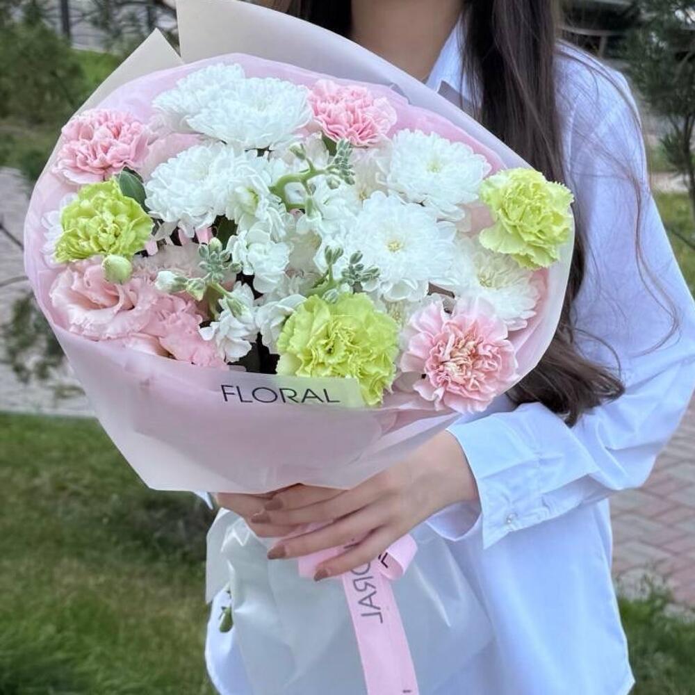 Лизиантус - 1 шт. Маттиола - 1 шт. Хризантема кустовая - 2 шт. Гвоздика - 6 шт.