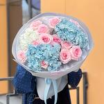 Букет нежный и пышный в составе 3 гортензия и 11шт розовый роза