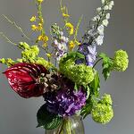 Антуриум - 1 шт. Вибурнум - 1 шт. Дельфиниум - 1 шт. Лизиантус - 1 шт. Маттиола - 1 шт. Фритиллярия - 1 шт. гортензия голландия - 1 шт. онцидиум - 3 шт.