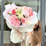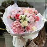 Гортензия - 2 шт. Хризантема кустовая - 2 шт. Роза - 5 шт. Эустома - 1 шт. Диантус - 4 шт.