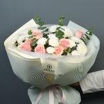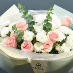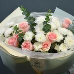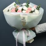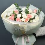 Авторский букет из нежно-розовых роз, хризантем и эвкалипта