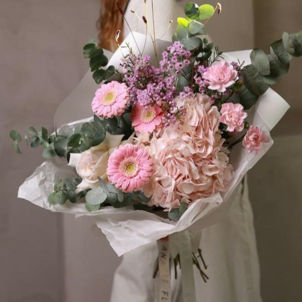 Гортензия - 1 шт. Эвкалипт - 1 шт. Гвоздика - 2 шт. Гербера - 3 шт. Гвоздика кустовая - 2 шт. Хамелациум - 2 шт. Упаковка дизайнерская - 1 шт. роза эквадор сортовая - 1 шт.