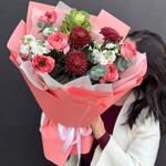 Маттиола - 2 шт. Хризантема одноголовая - 3 шт. Брассика - 1 шт. Эвкалипт Цинерея - 1 шт. роза мандарин экспрешен - 5 шт.