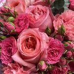 Диантус - 7 шт. Пионовидная роза - 11 шт. Эвкалипт Baby Blue - 5 шт. Спрей роза - 10 шт. гортензии - 3 шт.