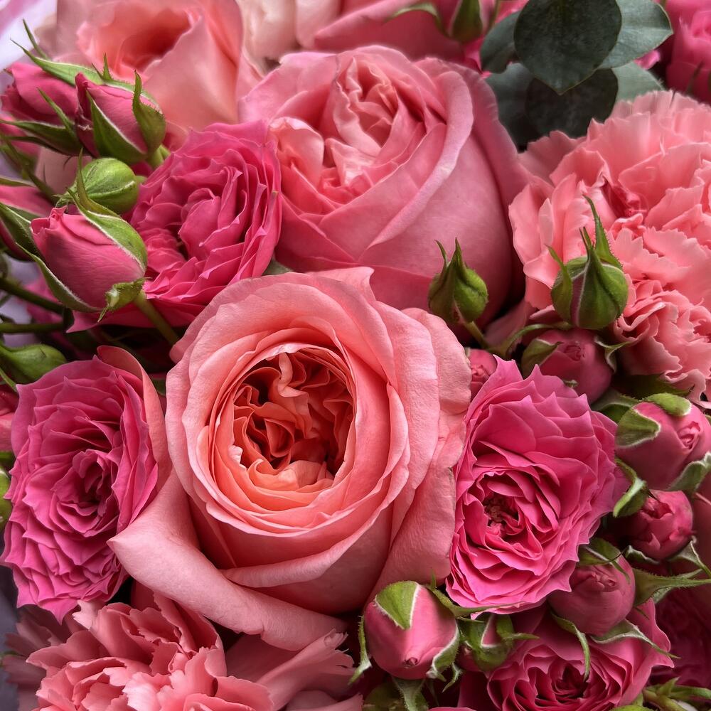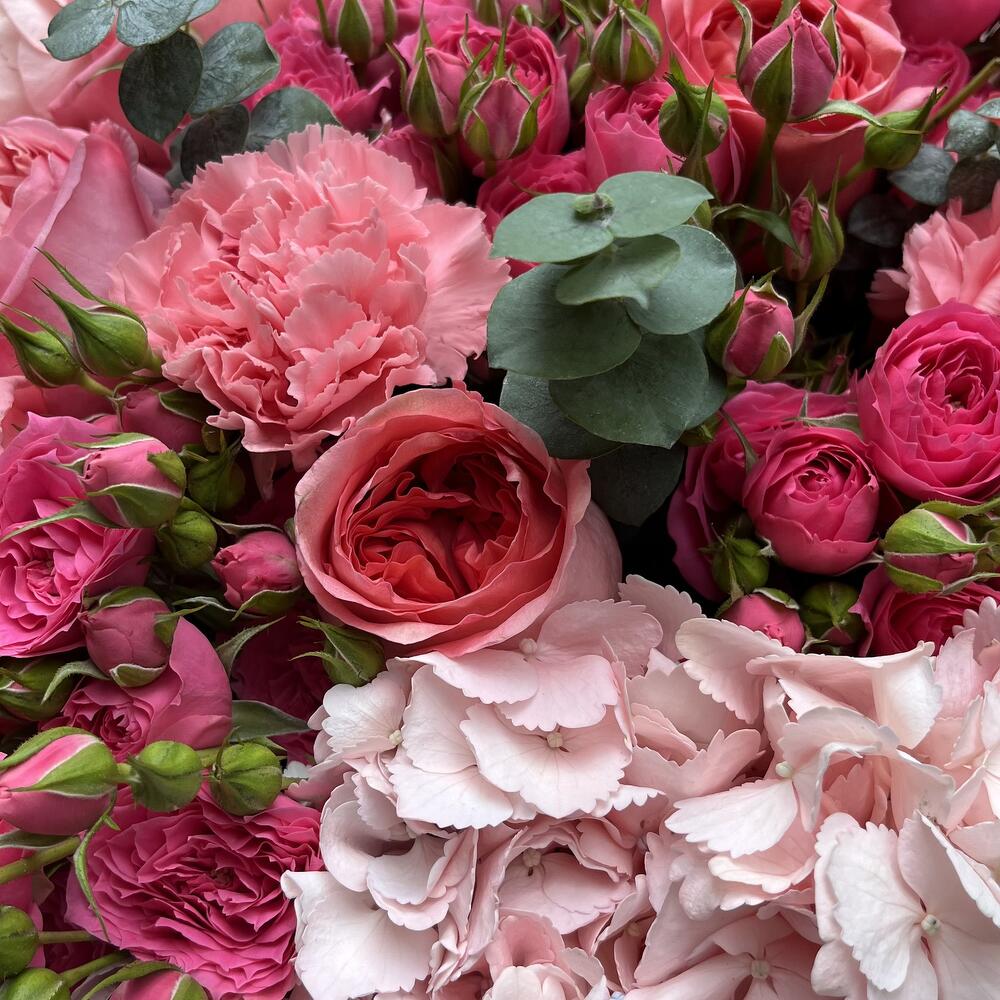 Диантус - 7 шт. Пионовидная роза - 11 шт. Эвкалипт Baby Blue - 5 шт. Спрей роза - 10 шт. гортензии - 3 шт.