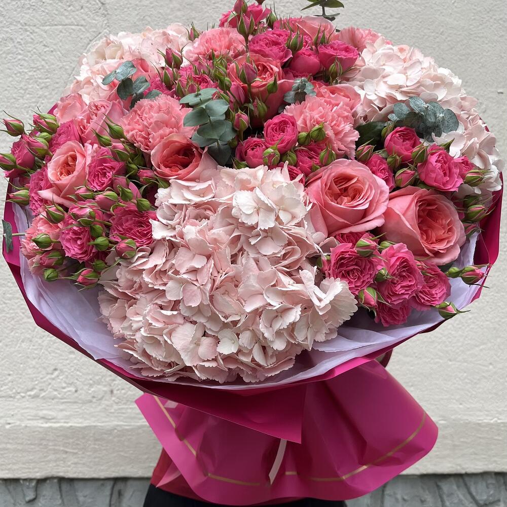 Авторский Букет Карамельное облако с гортензиями , пионовидными розами , спрей розами