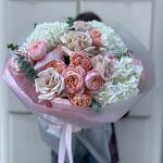 Гортензия - 3 шт. Эвкалипт Baby Blue - 5 шт. Дизайнерское оформление - 1 шт. джульетта кустовая роза пионовидная - 7 шт. квиксенд роза - 5 шт.