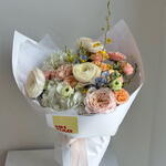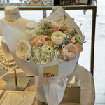 Нежный, воздушный букет в светлой молочно-кремовой палитре с пышными ранункулюсами и гортензией и розой «тсумуги» и изящной твидией. Многослойные бутоны создают эффект мягкого объёма, а небесно-голубые акценты твидии добавляют композиции свежесть и утончённую изюминку. Декоративная зелень подчёркивает природную элегантность букета, а полупрозрачная молочная упаковка и лента завершают образ сдержанной роскошью.