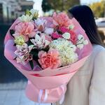 Гортензия - 1 шт. Роза кустовая - 1 шт. Хризантема кустовая - 1 шт. Эустома - 1 шт. Упаковка дизайнерская - 5 шт. лилия пионовидная - 2 шт. роза светло розовая - 5 шт.