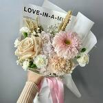 Нежнейшее сочетание белоснежной гортензии, розовой герберы и кремовых и белых гвоздик с интересным акцентом в виде колосьев пшеницы в дизайнерской упаковке. Состав букета может быть немного изменен, исходя из наличия цветов в салоне. Но мы гарантируем сохранить цветовую гамму и стиль букета.