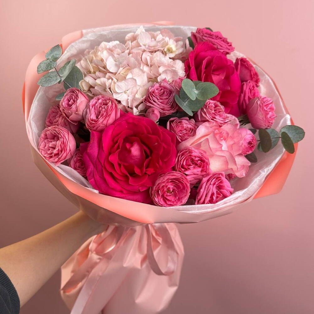Гортензия - 1 шт. Эвкалипт - 1 шт. Роза Эквадор - 3 шт. Роза кустовая пионовидная - 4 шт. Упаковка дизайнерская - 1 шт.