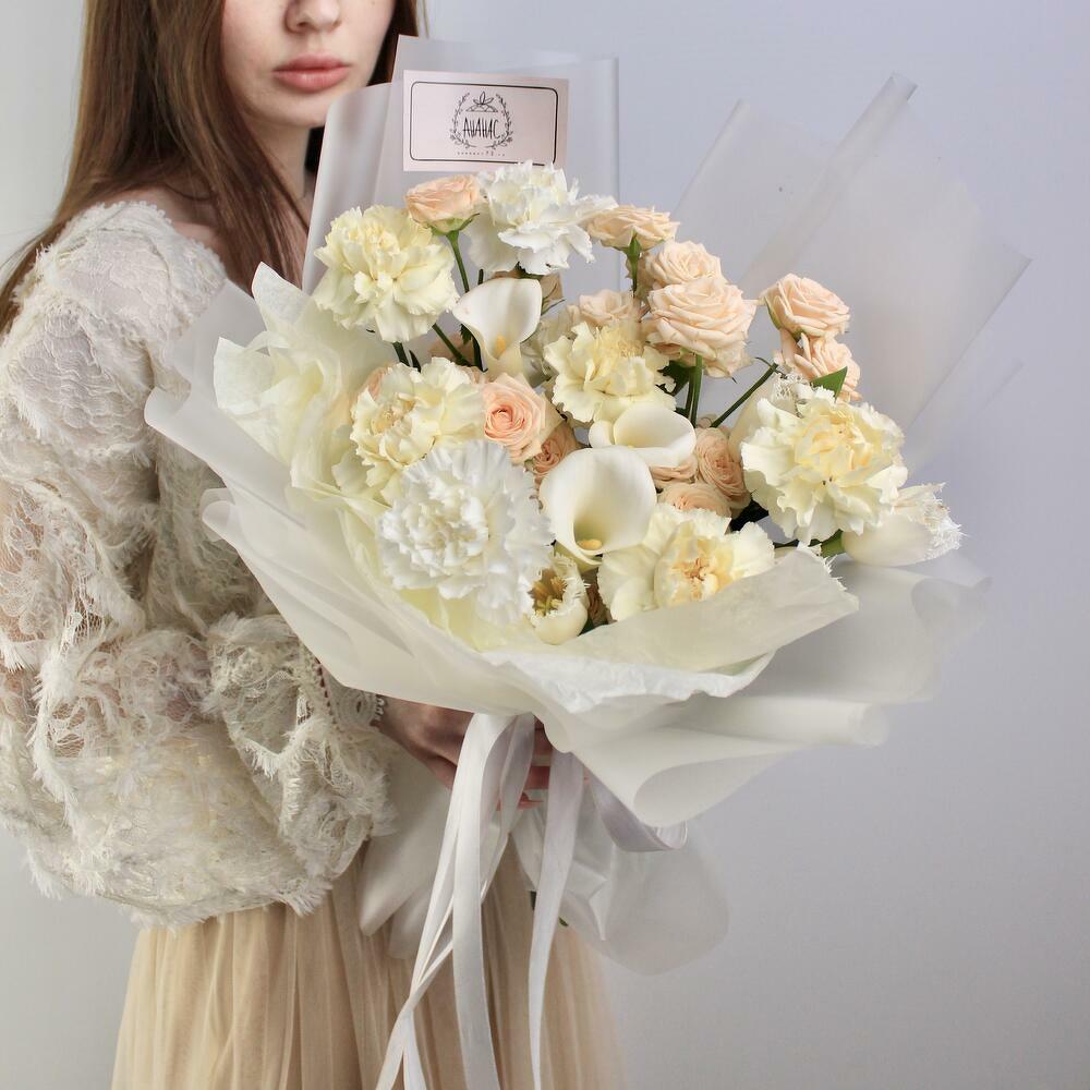 Нежный авторский букет в молочно-кремовых тонах, в составе которого: гвоздики, кустовые розы и каллы. Состав букета может быть немного изменен, исходя из наличия цветов в салоне. Но мы гарантируем сохранить цветовую гамму и стиль букета.