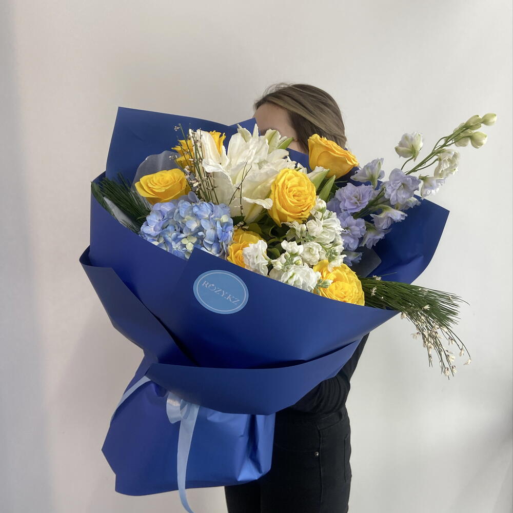 Гортензия - 1 шт. Дельфиниум - 1 шт. Лилия - 1 шт. Маттиола - 1 шт. Роза - 7 шт. Гениста - 1 шт.