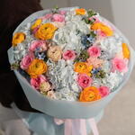 Гортензия - 6 шт. Эустома - 4 шт. Ранункулюс - 9 шт. Твидия - 5 шт. розы - 15 шт.