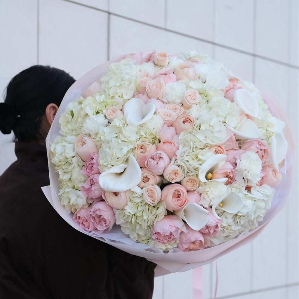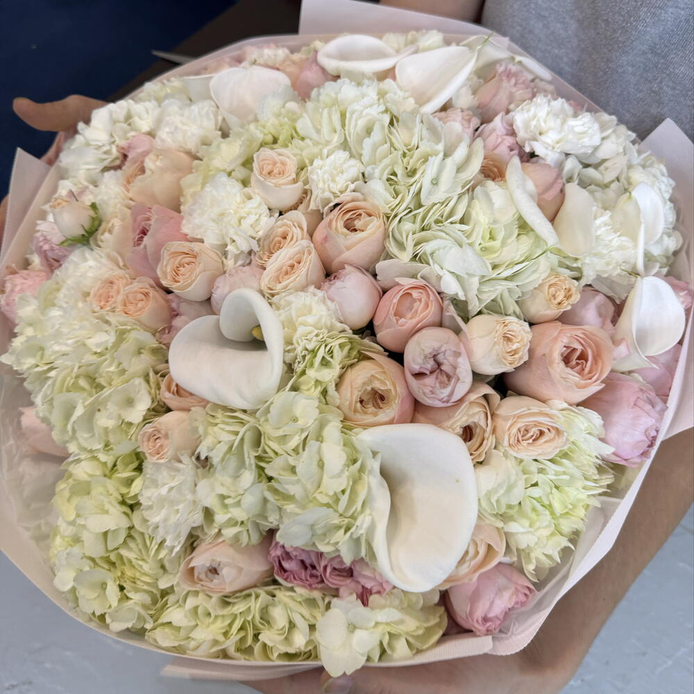 Гортензия - 13 шт. Гвоздика - 10 шт. Пионовидная роза - 20 шт. Кустовая пионовидная роза - 15 шт. каллы - 10 шт.
