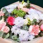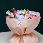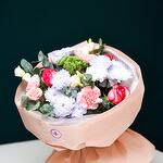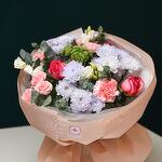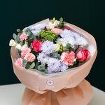 Эвкалипт - 3 шт. Роза - 3 шт. Кустовая роза - 3 шт. Хризантема - 3 шт. Упаковка - 1 шт. Гвоздика - 2 шт. Эустома - 3 шт.