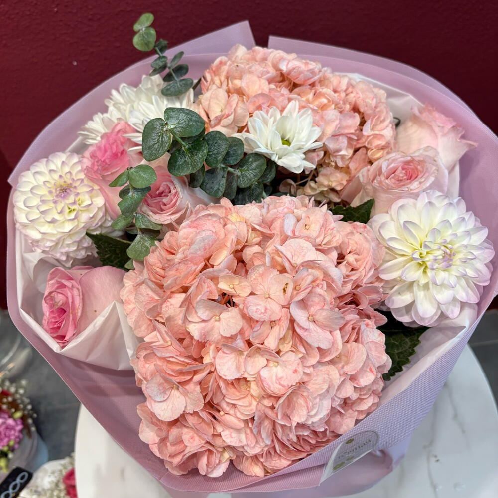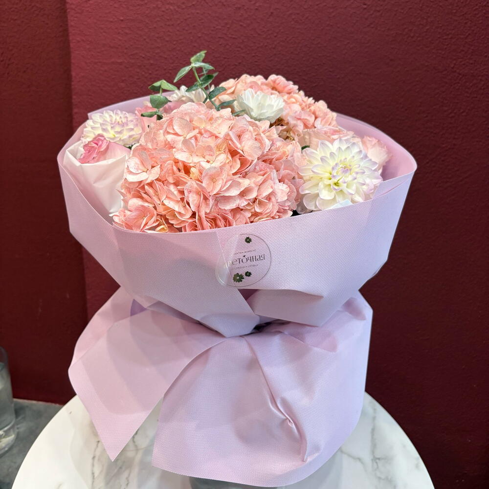 Гортензия - 2 шт. Эвкалипт - 3 шт. Роза - 5 шт. Хризантема - 3 шт. Георгина - 3 шт.